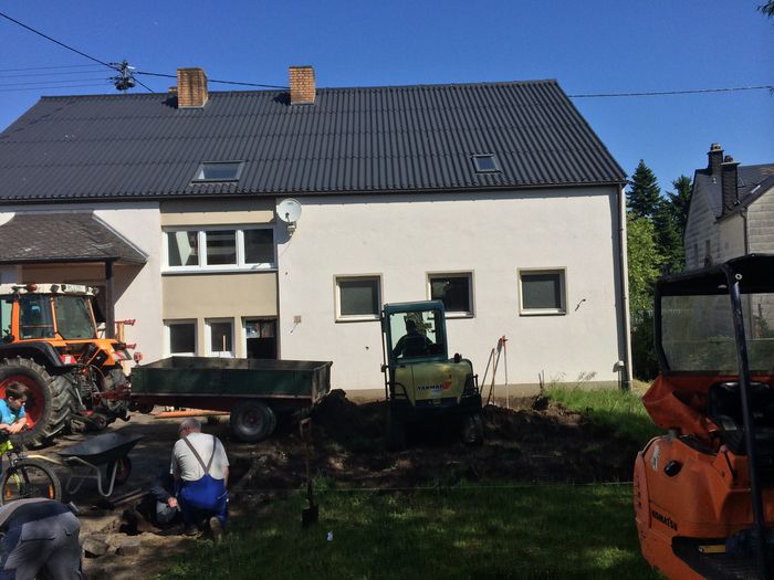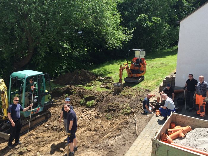 Die esten Arbeiten am Anbau haben begonnen. Am Samstag wurde die Baugrube für die Bodenplatte ausgehoben und die Entwässerung vorbereitet. Am darauffolgenden Montag die Tragschicht aus Schotter eingebaut.